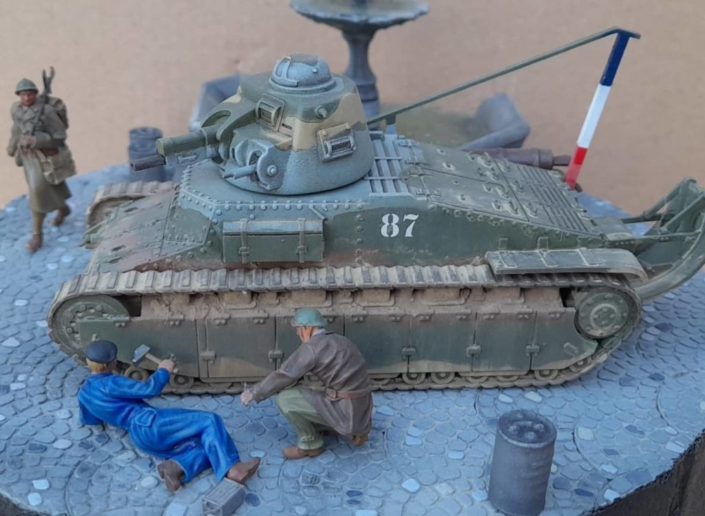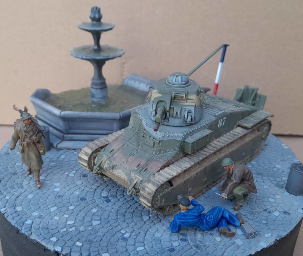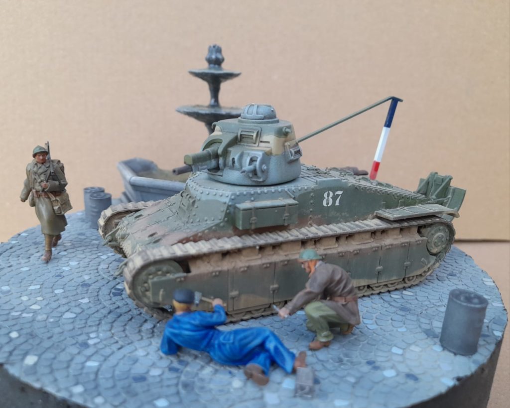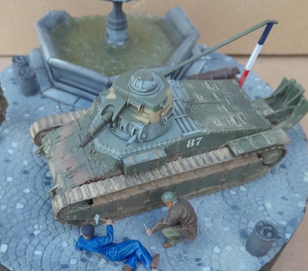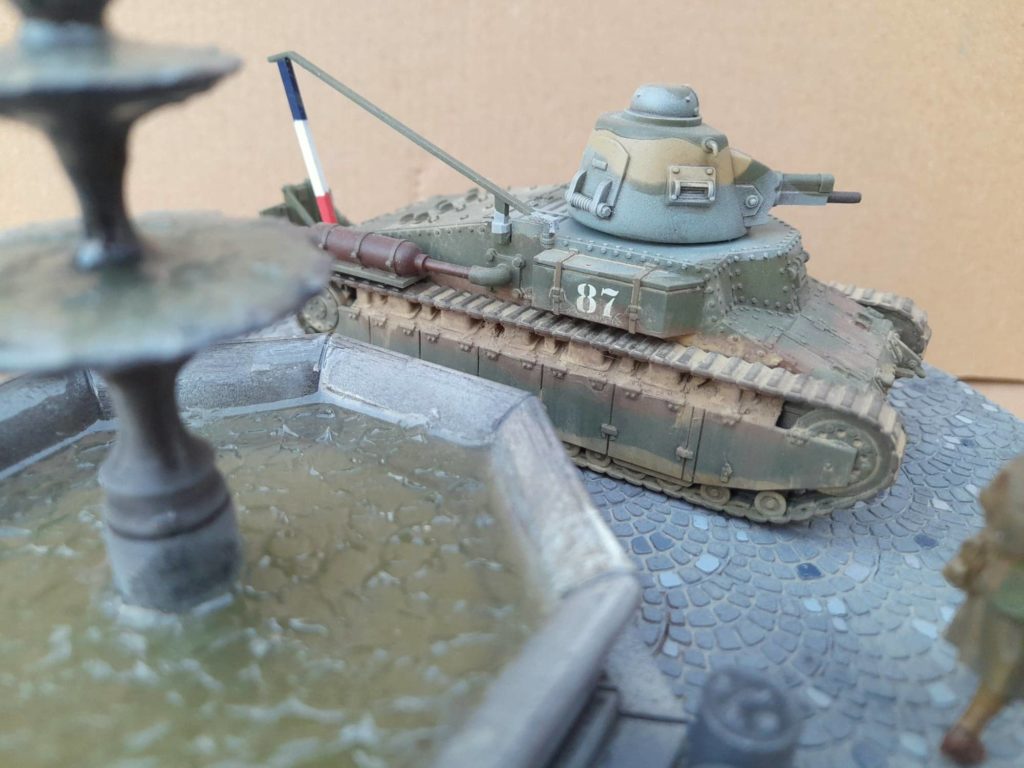 Petit diorama au 1/48 avec un char D1 en impressin 3D plutot mode Wargame accompagné de figurines Dynamo model. La fontaines, les bidons et les pavés sont également en impression 3D. LEs couleurs du char sont en XF58, XF60, XF68 et bleu XF23 de mémoire.