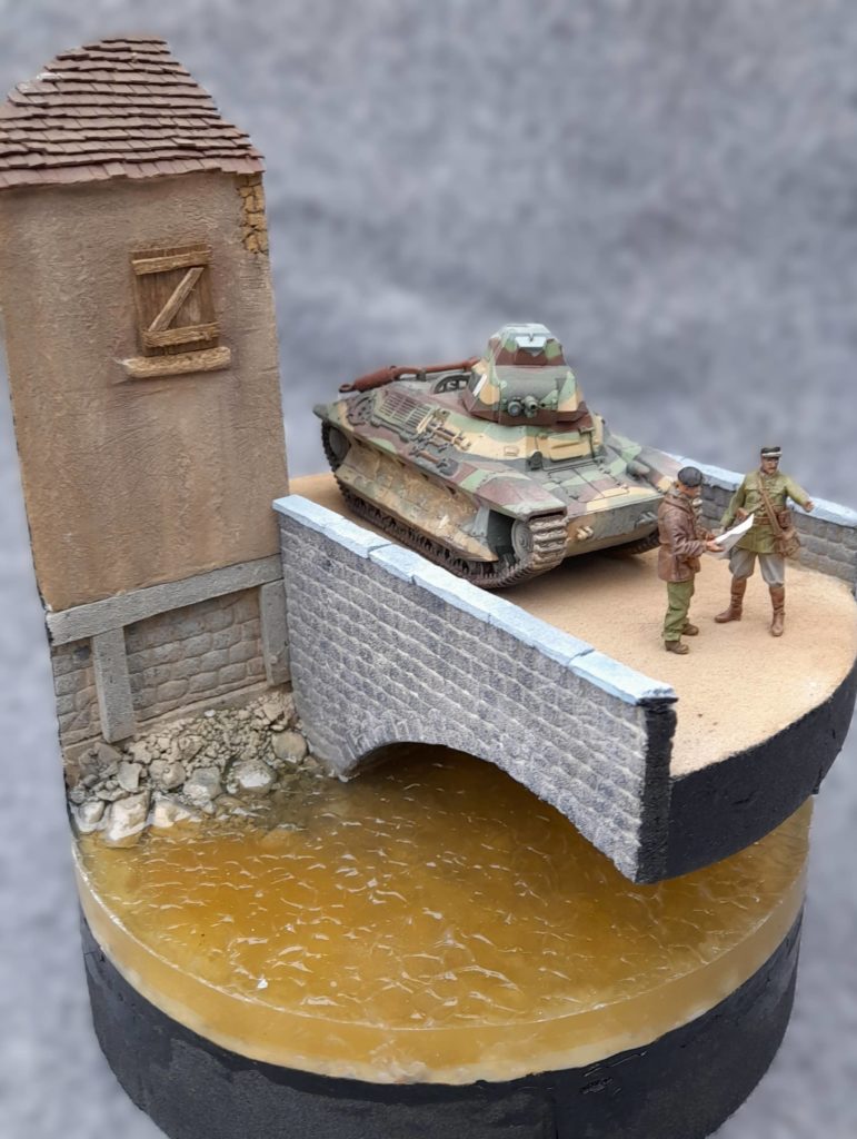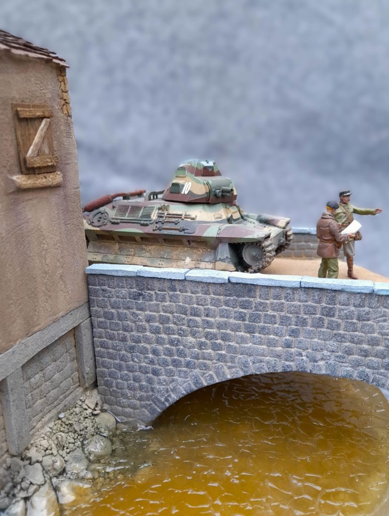 Le dio et les bâtiments sont entièrement faits avec du styrène et du carton plume. Le fond de la rivière est en litière pour chat peinte et patiné avec un effet mouss très dilué. L’étanchéité n’était pas extra et j’ai eu bc de mal a faire les coulées de résine Epodex. On voit d’ailleurs pas mal silicone et de gel acrylique utilisé pour ratrapper.
