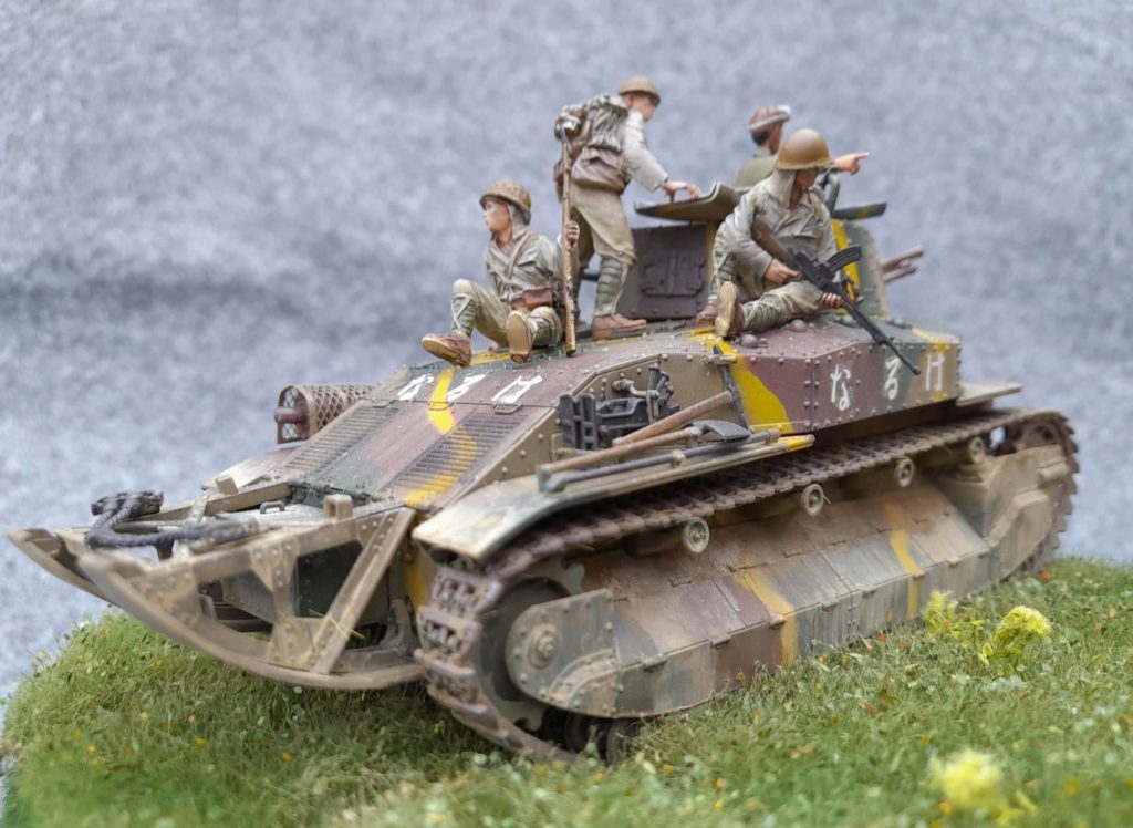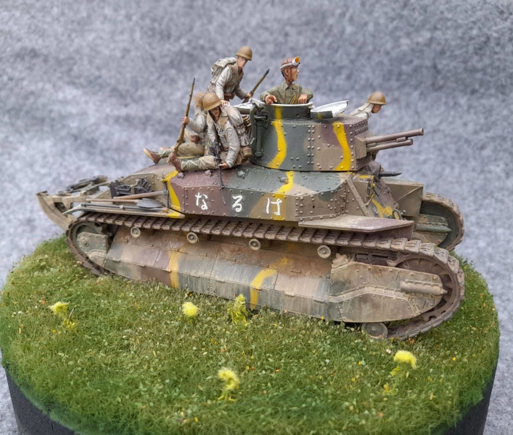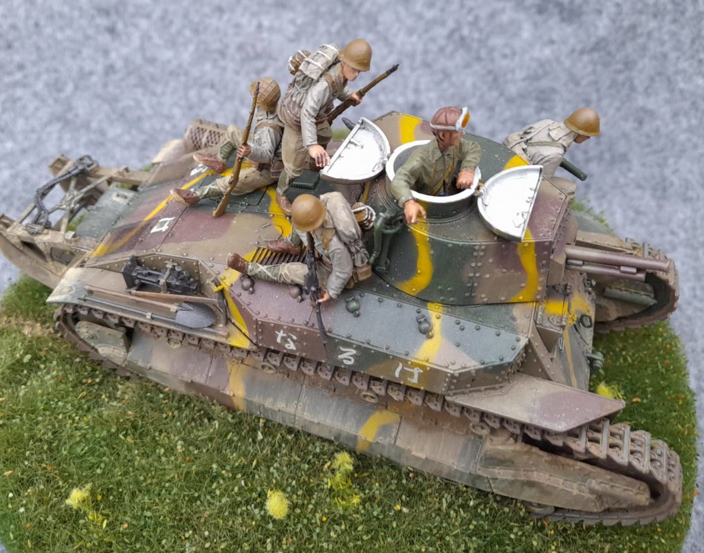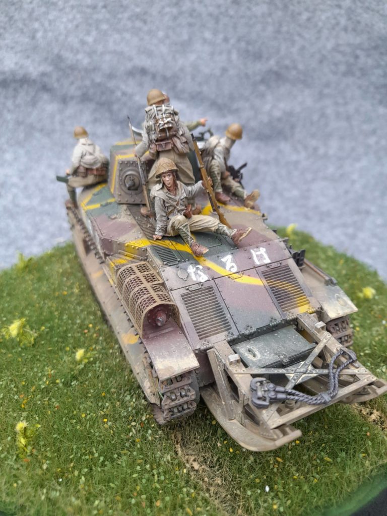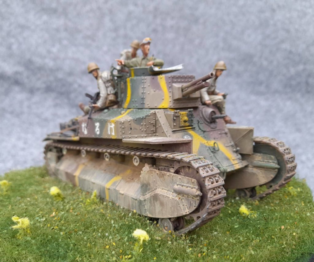 Le type 89 avec son look assez archaïque provient de chez Finemodls est fut vraiment très agréable à monter, précis, sans fragilité particulière ni difficulté. Même les chenilles vinyl étaient faciles à mettre en place. Je voulais un montage sans prise de tête, ça a été le cas. Le char est peint en XF49, XF13 et XF64. Les figurines en résines étaient originales mais pastoujours bien proportionnées, les casques étaient clairement trop gros. Avec un peu de bricolage, elles prenaient facilement place du char. Elles sont peintes en Vallejo 880, 987, 921 et 70328.